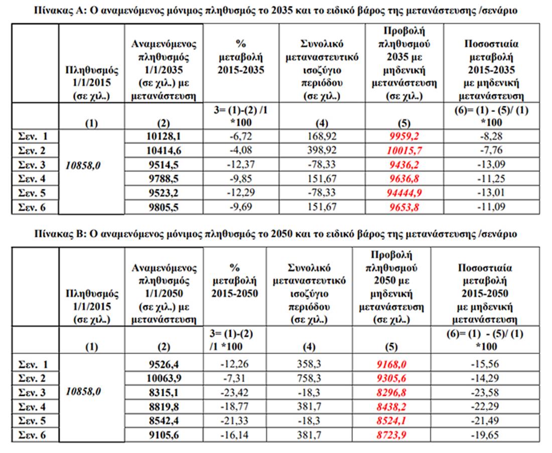 Στο τέλος της περιόδου που εξετάστηκε (2050) ο ελληνικός πληθυσμός θα είναι απο 10,0 έως 8,3 εκατομμύρια άνθρωποι, έναντι 10,9 εκατομμύρια το 2015, δηλαδή μειώσεις σε απόλυτες τιμές από 0,8 έως και 2,5 εκατομμύρια.