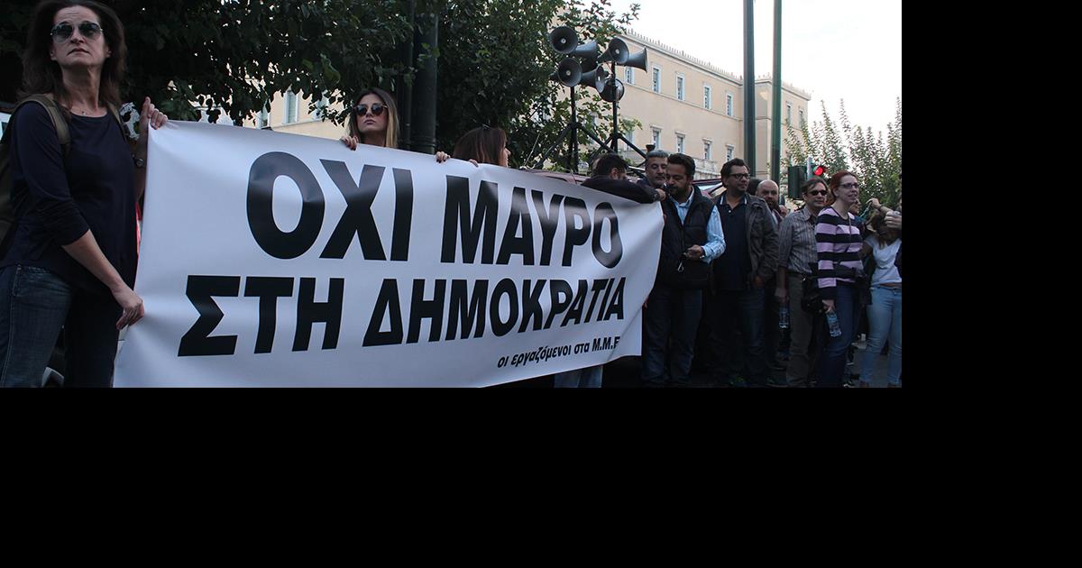Οι εργαζόμενοι στους τηλεοπτικούς σταθμούς, που πραγματοποιούν 4ωρη στάση εργασίας (12:00 - 16:00), ανήρτησαν μπροστά από την είσοδο της Βουλής ένα πανό στο οποίο αναγράφεται: "Το μαύρο δεν έχει αποχρώσεις", ενώ ένα άλλο έγραψε "Όχι μαύρο στη Δημοκρατία". Παράλληλα, φώναξαν και το σύνθημα «Τσίπρα και Παππά, βάλτε το στο μυαλό σας καλά, όλα τα κανάλια θα μείνουν ανοιχτά».