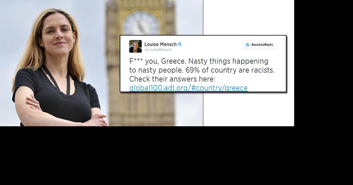 «Άντε γαμ**** Ελλάδα! Άσχημα πράγματα συμβαίνουν σε κακούς ανθρώπους. Το 69% του πληθυσμού είναι ρατσιστές», έγραψε στο λογαριασμό της στο twitter η πρώην βουλευτής του Συντηρητικού Κόμματος της Βρετανίας, Λουίζ Μενς.