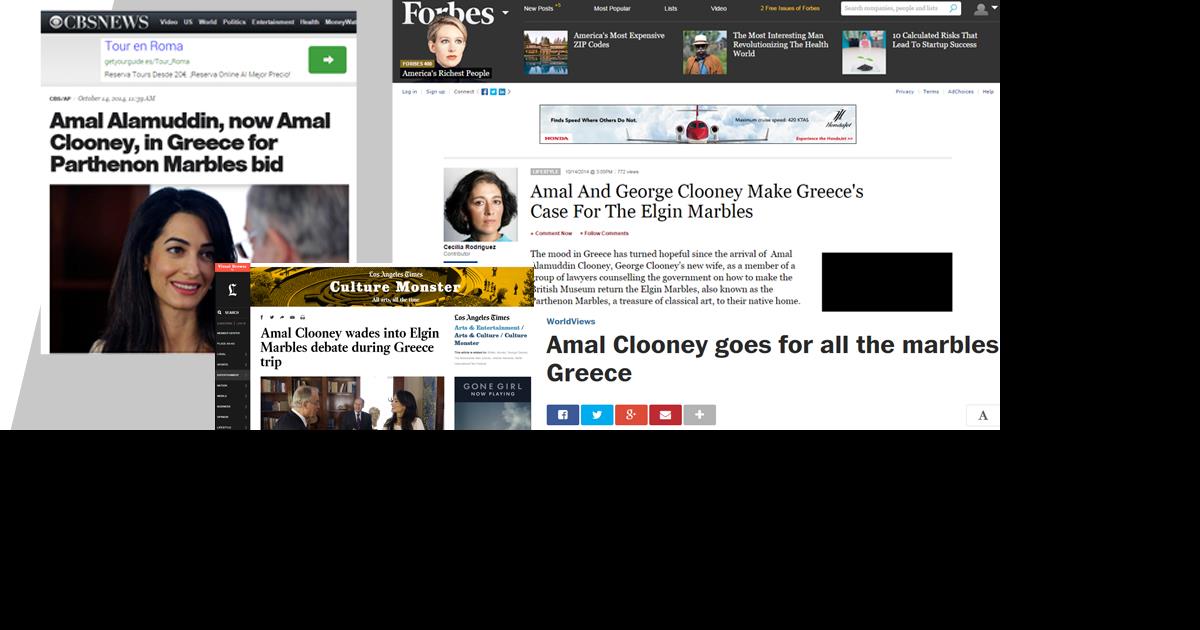Η νομική συνδρομή της Amal Alamuddin στο θέμα της επιστροφής των γλυπτών του Παρθενώνα γεμίζει ελπίδες τους Έλληνες, γράφει η C. Rodriguez στο FORBES και καταρρακώνει τους Βρετανούς, καθώς πλέον συνοδεύεται από χολιγουντιανή ισχύ («Amal and George Clooney Make Greece’s Case for the Elgin Marbles»). Στο άρθρο παρατίθενται πληροφορίες από την Καθημερινή, που σχετίζονται με την ανάμιξη της δικηγόρου αλλά και της νομικής φίρμας για την οποία εργάζεται. Πρόκειται για ανάμιξη που χρονολογείται από το 2011, όταν, μετά από αίτημα της ελληνικής κυβέρνησης, διερευνήθηκαν οι δυνατότητες της βρετανικής νομοθεσίας, καθώς και το σε ποια δικαστήρια μπορούσε να προσβληθεί η κατοχή των γλυπτών από το Βρετανικό Μουσείο. Τόσο ειδικοί όσο και δημοσιογράφοι στην Αγγλία εκτιμούν ότι η προσφορά της κας Alamuddin θα αποτελέσει ισχυρό ατού για την Ελλάδα. Μετά τη δημιουργία του Μουσείου Ακροπόλεως το επιχείρημα του Βρετανικού Μουσείου ήταν πως η ύπαρξη των γλυπτών στο Λονδίνο «επιτρέπει διαφορετικά αφηγήματα για τα γλυπτά”. Αναφέρεται η ανάμιξη της UNESCO που ζητήθηκε πέρυσι από την ελληνική κυβέρνηση και το γεγονός ότι δεν δόθηκε ποτέ απάντηση από τον Βρετανό ΠΘ Cameron. Η δημοσιογράφος καταλήγει ότι προφανώς η Ελλάδα αποφάσισε να ακολουθήσει τη δικαστική οδό.