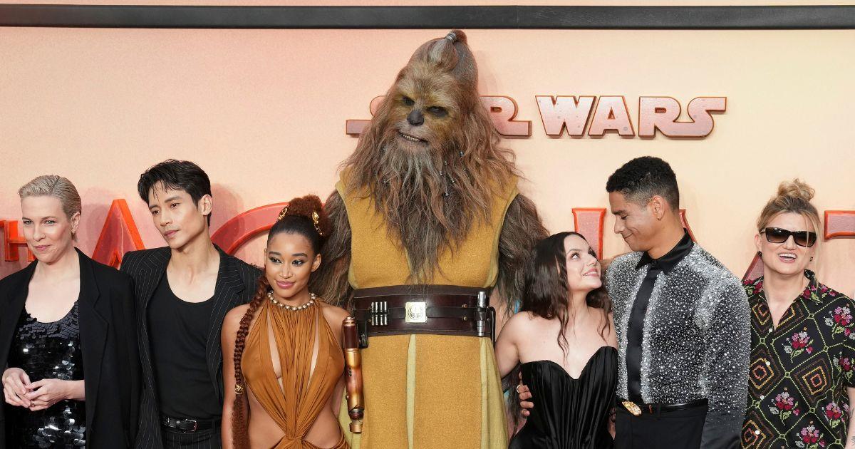 Rayne Roberts, from left, Rebecca Henderson, Manny Jacinto, Amandla Stenberg, Chewbacca, Dafne Keen, Charlie Barnett and Lee Jung-Jae pose for photographers at the UK Premiere of the film 'The Acolyte' in London, Tuesday, May 26, 2024.