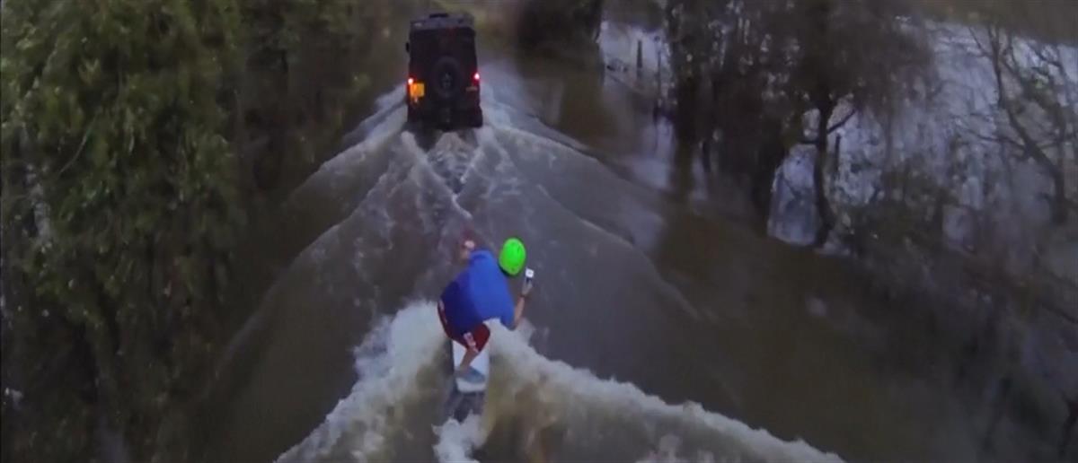 Μία σανίδα, ένα σχοινί, ένα τζιπ 4x4 και αρκετή δόση τρέλας… ήταν όσα χρειάστηκαν τρεις νεαροί Βρετανοί για να σερφάρουν σε έναν πλημμυρισμένο επαρχιακό δρόμο της νότιας Αγγλίας.