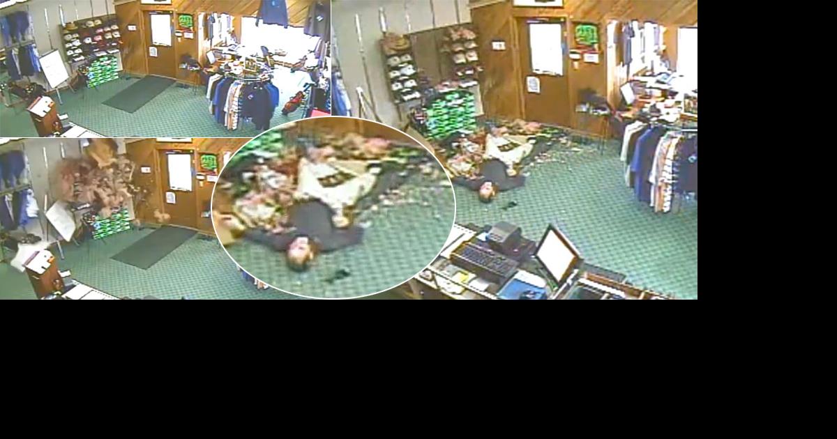 Ο νεαρός ξαπλώνεται φαρδύς πλατύς στο πάτωμα, ενώ πάνω του πέφτουν κομμάτια από την οροφή, αλλά και εμπορεύματα! Το αστείο είναι ότι ακούγεται η φωνή του φίλου του να τον χαιρετά, λες και η «είσοδός» του ήταν φυσιολογική, ενώ και ο άτυχος νέος-αν και ανήμπορος να σηκωθεί από το πάτωμα-ανταποδίδει τον χαιρετισμό!