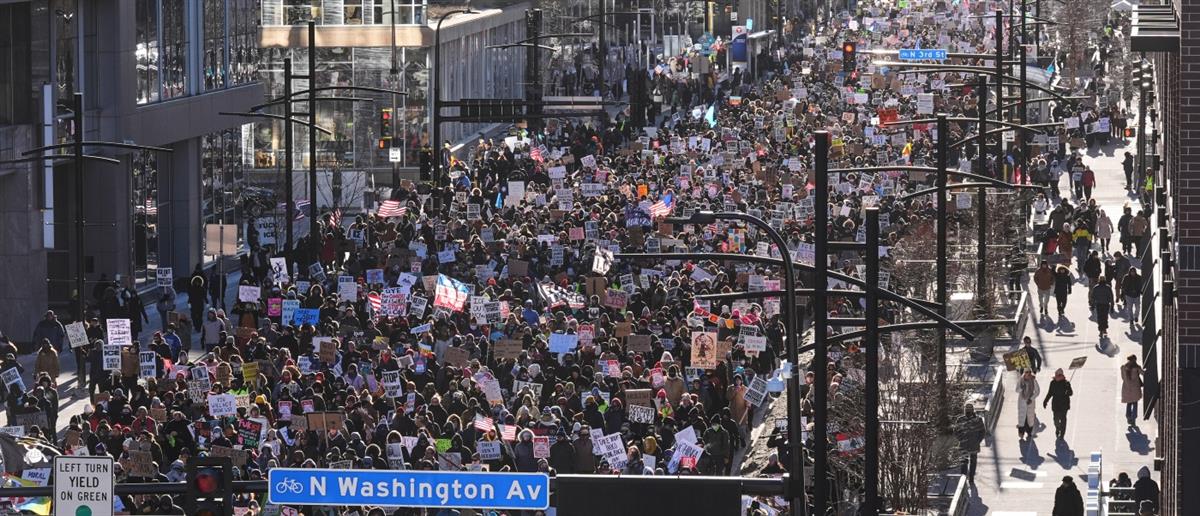 Διαμαρτυρόμενοι για την ανάπτυξη και τις τακτικές που χρησιμοποιεί η αστυνομία μετανάστευσης ICE, χιλιάδες άνθρωποι συγκεντρώθηκαν στο κέντρο της Μινεάπολης παρά το έντονο κρύο, μεταξύ των οποίων οικογένειες με μικρά παιδιά, ζευγάρια ηλικιωμένων και νεαροί ακτιβιστές.